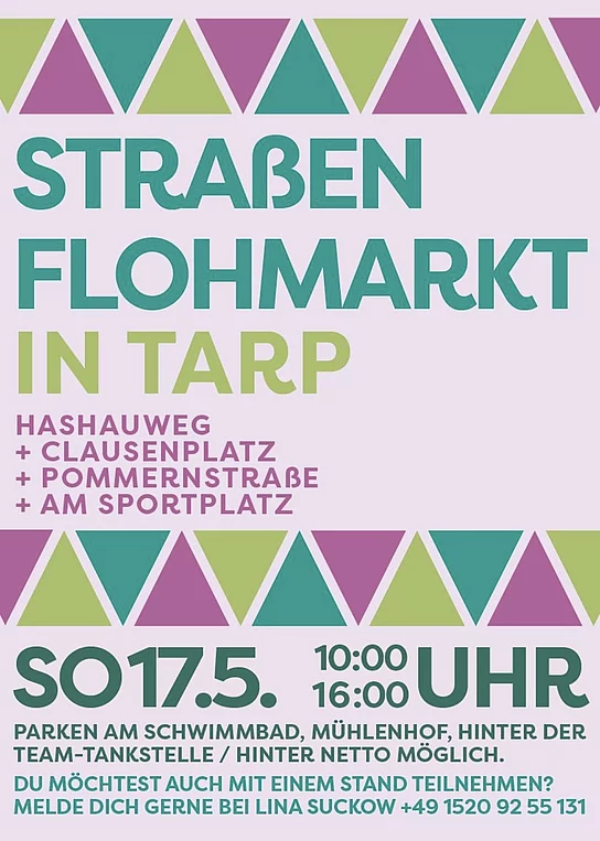 Am 17.05. findet von 10 Uhr bis 16 Uhr zum dritten Mal der Straßenflohmarkt im Hashauweg in Tarp statt. Auch in den Straßen Clausenplatz, Am Sportplatz und der Pommernstraße wird es Stände geben.